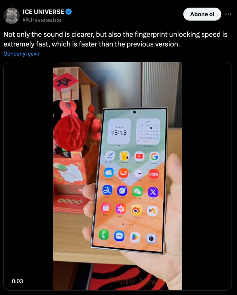 Sızıntılarıyla bilinen Çin merkezli Ice Universe, Galaxy S24 modellerindeki parmak iziyle kilit açma hızına dair bazı olumlu gelişmeleri paylaştı. Söz konusu özellik, hız bakımından iyileştirilmiş olacak ve sesin daha net hale geleceği de belirtiliyor.