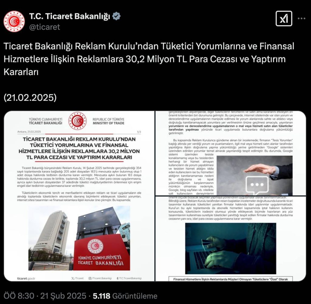 Reklam Kurulu, ayrıca 14 Şubat 2025’te yaptığı toplantıda, 205 dosyadan 183’ü için 30,2 milyon TL idari para cezası kesildiğini açıkladı. 37 dosyada ise, tüketici mağduriyetinin önüne geçmek amacıyla erişim engeli uygulanması kararlaştırıldı. Bu yeni düzenleme, internet üzerindeki yorum ve derecelendirme sistemlerinin manipülasyonunu engellemeyi hedefliyor.