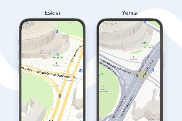 Haritaların geniş yakınlaştırma seviyelerinde, yollar gerçek dünyadaki gibi gri tonlarla gösterilirken; Galata Kulesi, Ayasofya gibi simgesel yapılar ise fotoğraf temsilleriyle işaretleniyor. Bu da kullanıcıların çevredeki önemli noktaları daha kolay fark etmesini ve yönünü bulmasını destekliyor. Navigasyon moduna geçildiğinde ise trafik durumu daha net sunuluyor ve sokak isimleri daha görünür hale geliyor.
